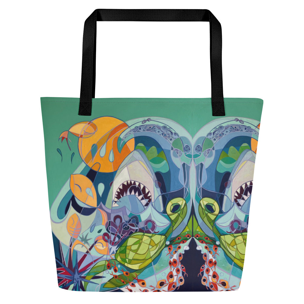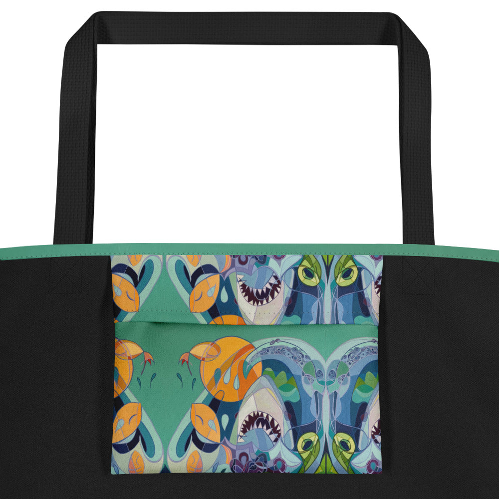 This roomy 16x20" beach bag is made from 100% polyester and features Under the Sea, an original painting by Ali. Made to order with vibrant, fade-resistant colors, it includes a large interior pocket to keep your essentials organized—perfect for beach days and everyday adventures.